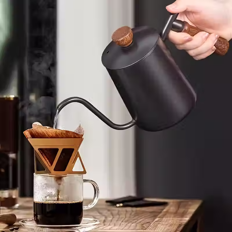 Cafetera de Acero Inoxidable de 600ml con Mango de Madera - Infusión por Goteo, Diseño de Pico Largo para Uso Doméstico